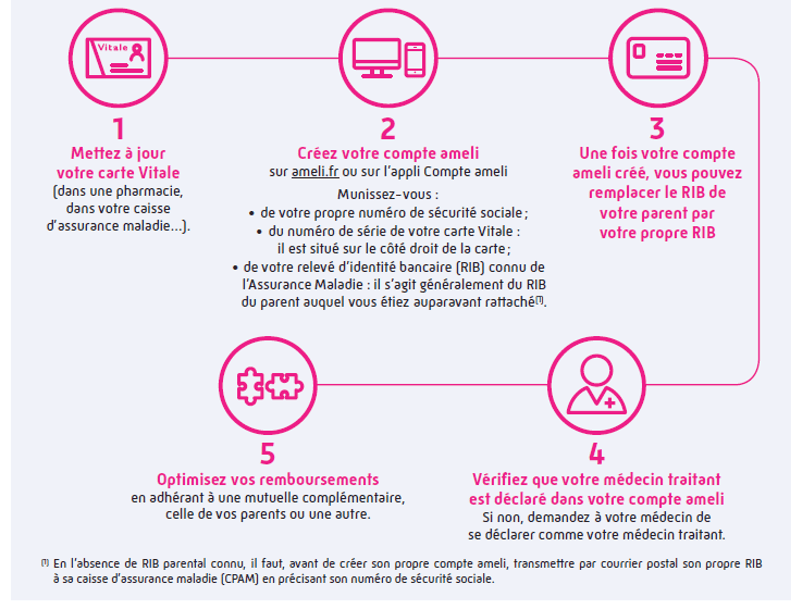Le jeune reçoit sa carte Vitale à 16 ans sur laquelle sont enregistrées les informations liées à ses parents, puisqu’il est « ayant-droit » de ses parents. À 18 ans, lorsqu’il devient un assuré autonome, il doit créer son propre compte ameli avec ses informations personnelles. Il faut donc mettre à jour la carte Vitale afin qu’elle prenne en compte ces modifications.